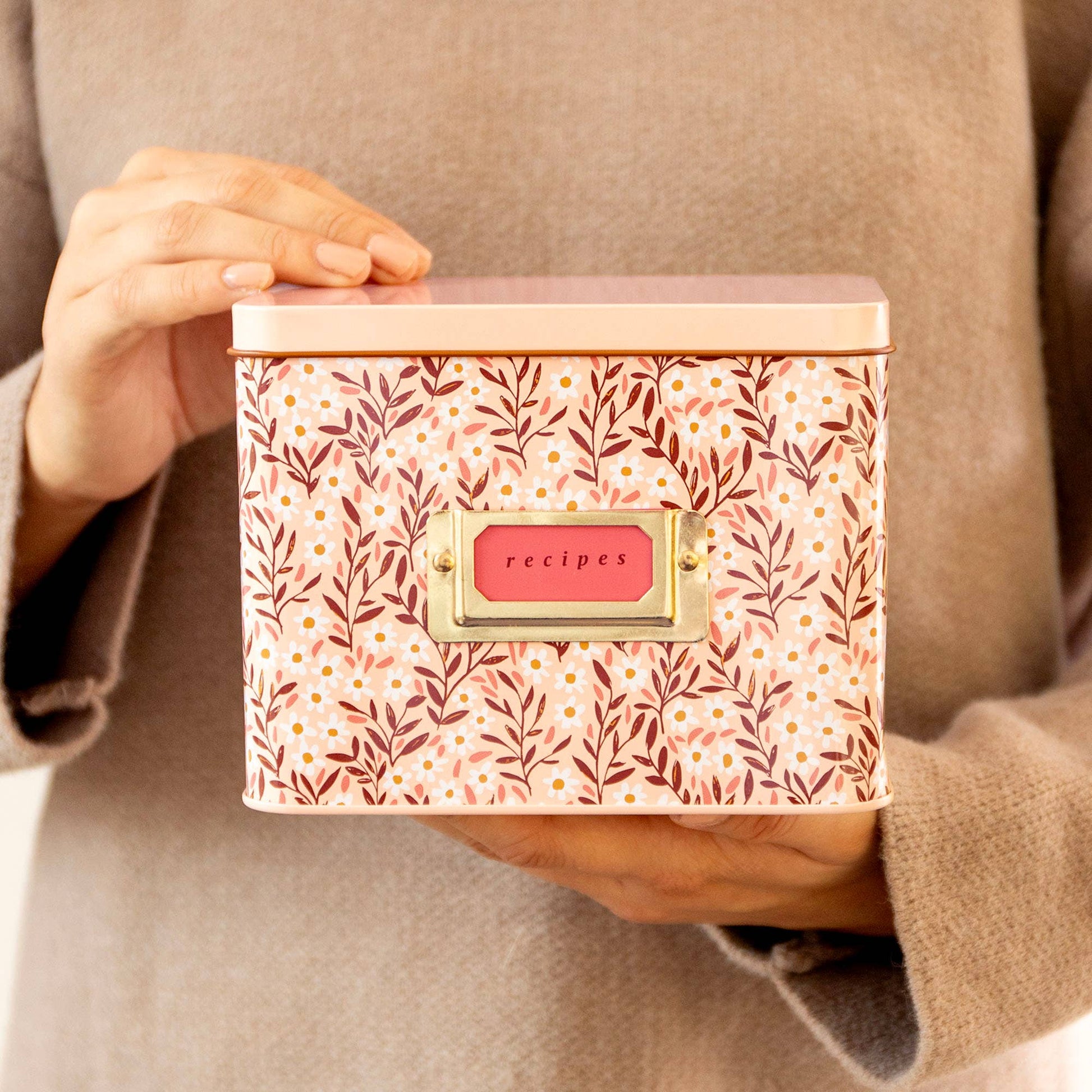 Features | Hinged lid, metal bookplate on front, includes 15 Pink Daisy Recipe Cards and 1 pack of Dark Herringbone Recipe Divider Tabs